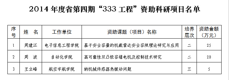 根据江苏省教育厅《关于公布高校2014年度省第四期“333工程”资助科研项目的通知》(苏教办师�2014�60号),我校周建江等3名教师申报的科研项目获得资助,具体名单附后。