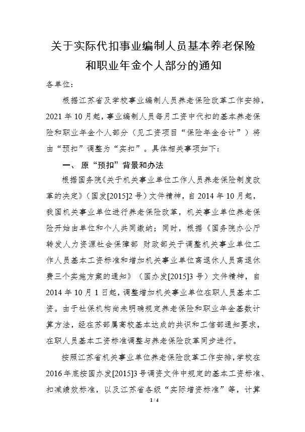 关于实际代扣事业编制人员基本养老保险和职业年金个人部分的通知