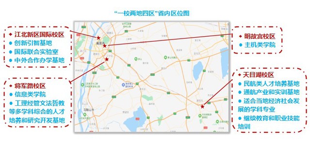 学校现有明故宫、将军路、天目湖三个校区,江北新区国际校区正在规划建设中,“一校四区”办学新格局已初步形成。