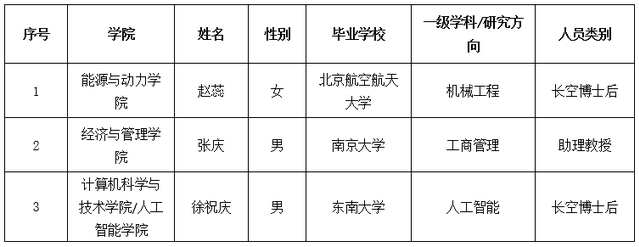 根据《南京航空航天大学师资引聘管理办法》(校人字[2016]14号)、《南京航空航天大学新聘教师准聘长聘制度实施办法》(校人字[2023]40号)、《南京航空航天大学博士后研究人员管理办法》(校人字[2021]8号)的通知,经个人申请、学院(流动站)审核推荐、学校审批等程序,2024年3月第1次拟聘教师共计3名。现将基本情况公示如下: