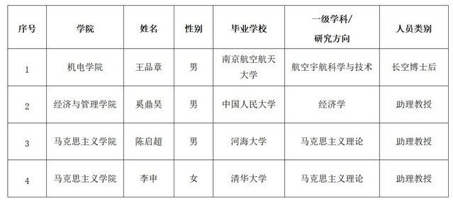 根据《南京航空航天大学师资引聘管理办法》(校人字[2016]14号)、《南京航空航天大学新聘教师准聘长聘制度实施办法》(校人字[2023]40号)、《南京航空航天大学博士后研究人员管理办法》(校人字[2021]8号)的通知,经个人申请、学院(流动站)审核推荐、学校审批等程序,2024年4月第2次拟聘教师共计4名。现将基本情况公示如下: